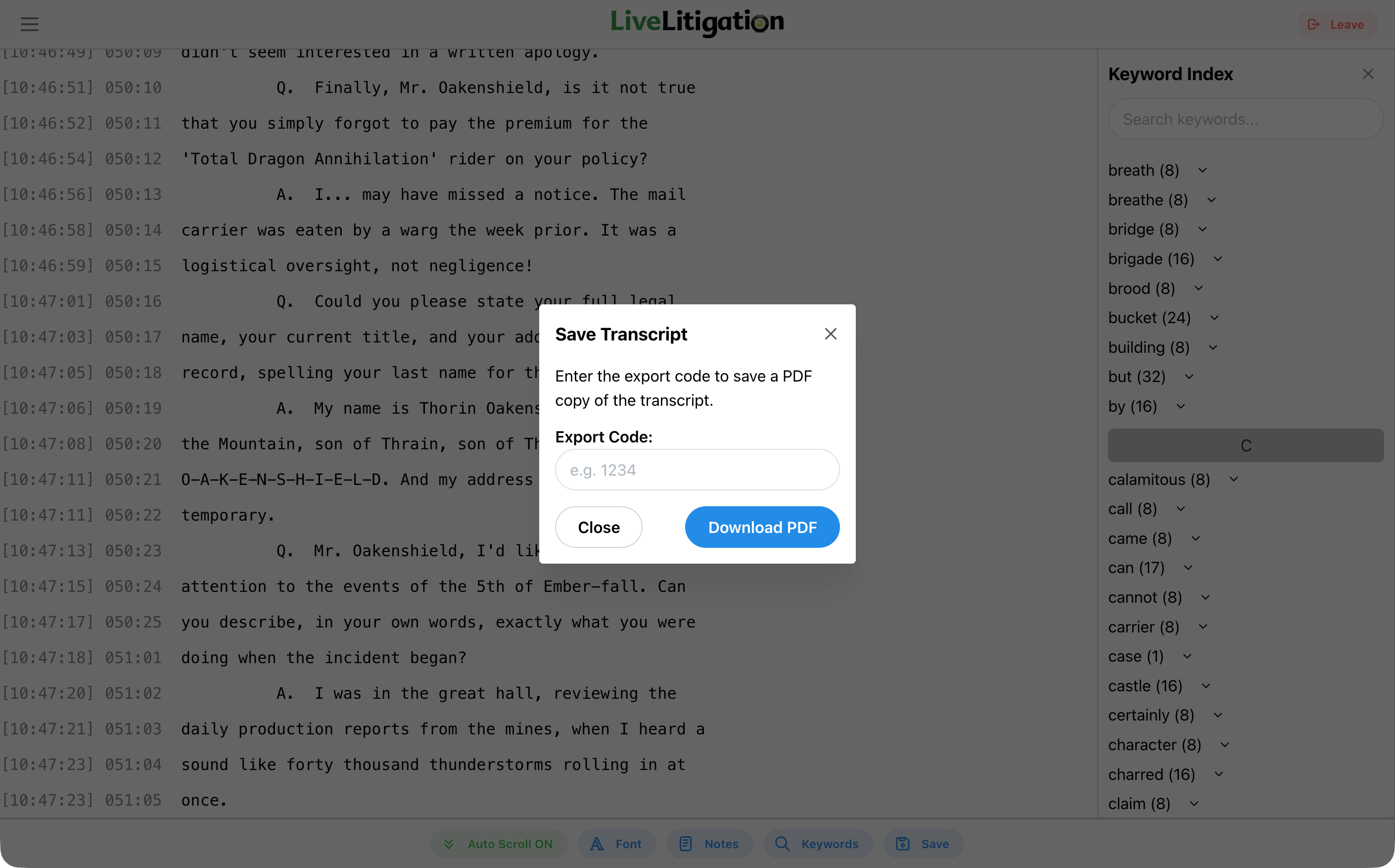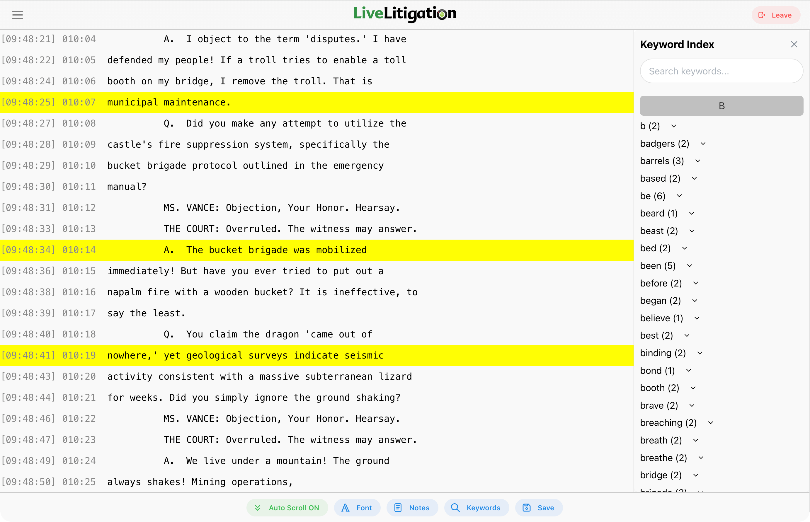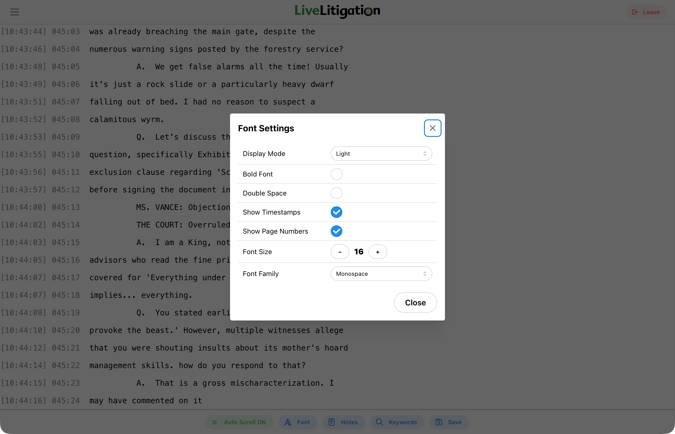 When viewing the transcript, ensure Auto Scroll is enabled to stay live with the court reporter's text.