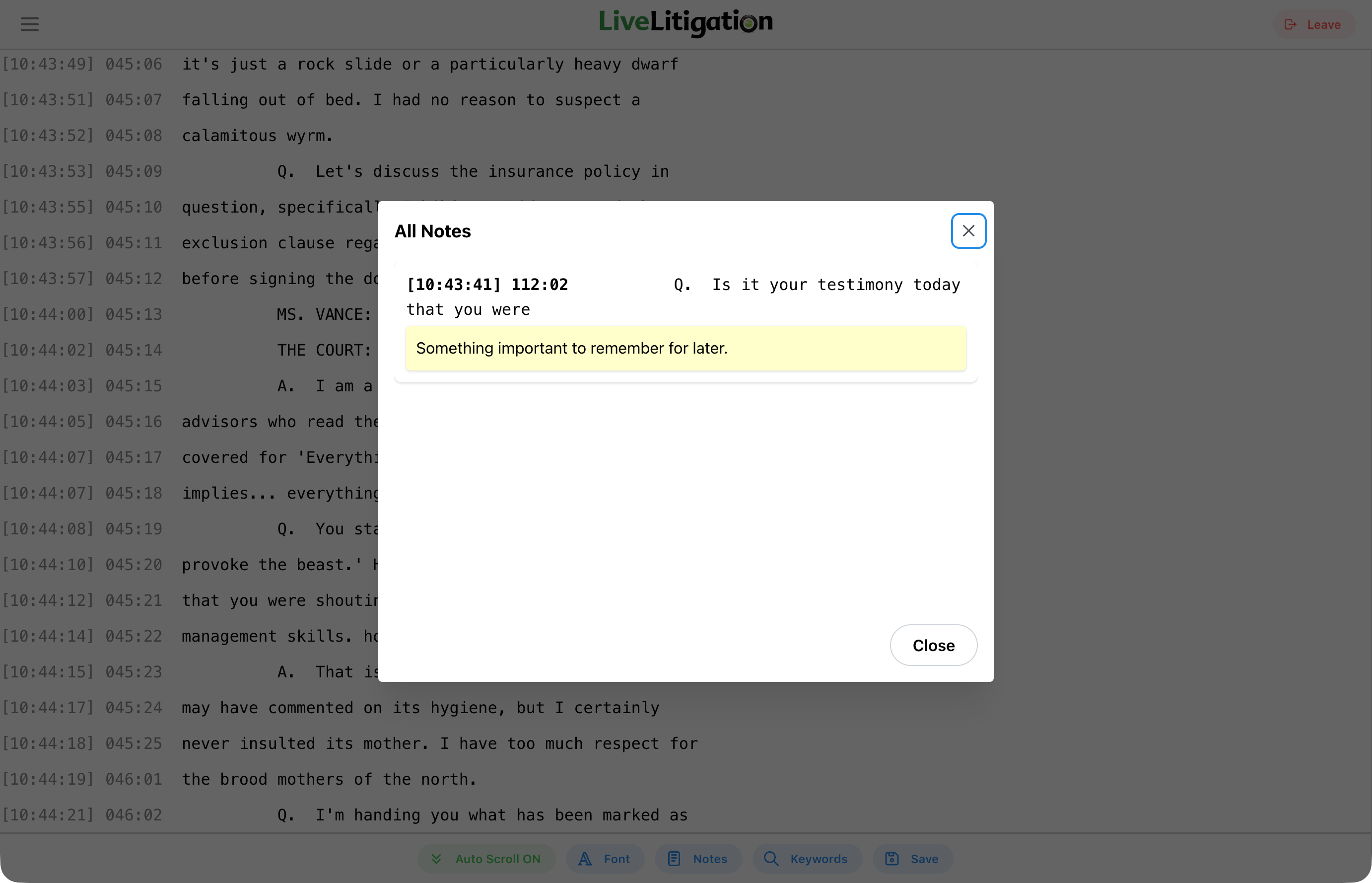 Customize your view, search the transcript, and add notes during a LiveLitigation event.
